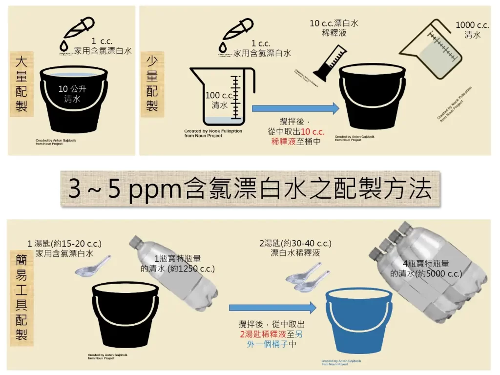 腸病毒對酒精無效,僅含氯漂白水(500ppm)可有效滅毒。家用漂白水(5~6%)可依 80~100ml 加 10 公升清水方式調配,用於桌椅、門把、開關、玩具等表面消毒。